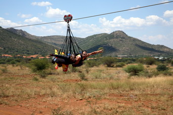 The ride starts just 2m above the ground but the ground falls away rapidly to 100m. Speed builds up rapidly as you fly out from the koppie. With heights varying between 3m and 280m. You reach a fastest speed of 140-160 km/h over a ride of 1 minute, averaging 120km/h. You experience the feeling of flying and acceleration as you descend down the wire. The cable runs from the top of the 280m high koppie (hill) to the top of a mast 2km away. Towards the end of the ride, the decent is slowed as you go uphill, then you roll back to the lowest point on the wire where you are assisted to dismount the ride.